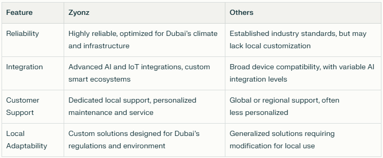 Energy management plays a pivotal role, with AI optimizing consumption and integrating renewable energy sources to support eco-friendly living. By combining these innovations, Zyonz delivers tailor-made smart home ecosystems in Dubai, offering residents secure, adaptive, and energy-efficient living spaces designed for modern lifestyles.